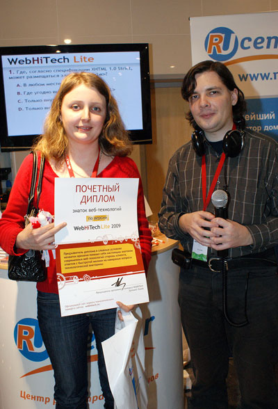 В ходе викторины ведущие задали посетителям стенда компании RU-CENTER, где она и проводилась, полтора десятка вопросов, связанных с веб-стандартами. Вопросы были новыми, они не повторяли задания викторины WebHiTech Lite, проводившейся весной на конференции РИТ-2008.
